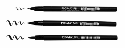 Pigma Professional Brush pens offer the ultimate in versatility, producing a range of marks ranging from super fine hairlines to big, broad strokes. The flexible and durable brush nibs respond to instant changes in pressure or direction with a silky smooth, accurate and consistent ink flow. The deep black, archival quality Pigma ink is chemically stable, waterproof and fade resistant. There is consistent ink delivery to the brush sides and tip, with no smears, feathers or bleed-through on most papers. The fine brush nib is made of a tough porous polyethylene material, the medium brush from a tough nylon material and the bold brush from a tough plastic polyacetal material.